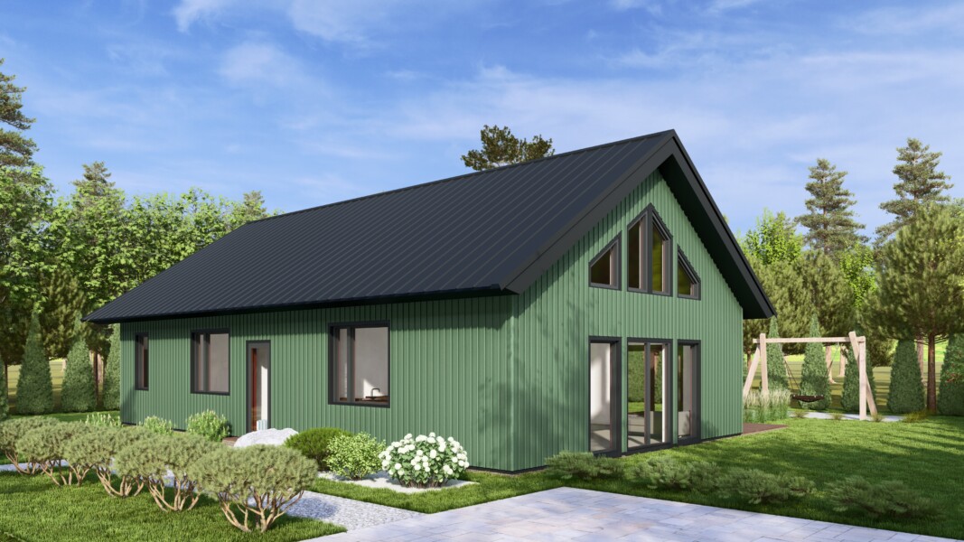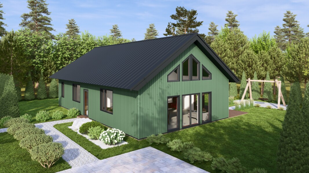 Лаконічна архітектура з двосхилим дахом і великими вікнами робить будинок візуально легким і світлим. Sherwood гармонійно вписується як у природне оточення, так і в котеджну забудову.