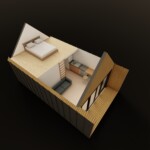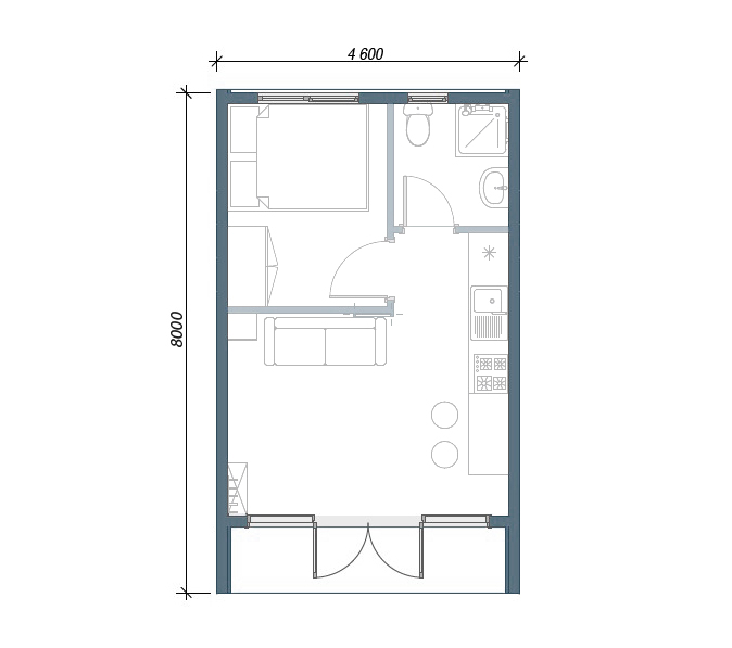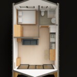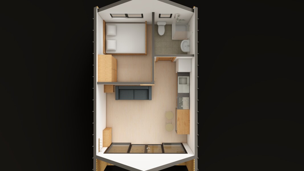 Второй уровень выполнен в формате антресоли — это может быть спальня, лаунж-зона или приватное пространство для отдыха. Благодаря удлинённой форме дома вы получаете больше полезной площади без увеличения бюджета.